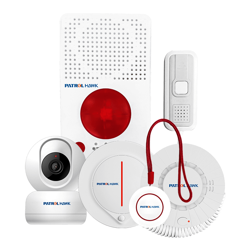 Standard Kit C includes a gateway, power adapter,smoke detector,gas leakage detector,emergency button(for Washroom),indoor IP camera.When an alarm is triggered, users can remotely access the camera to view real-time video.